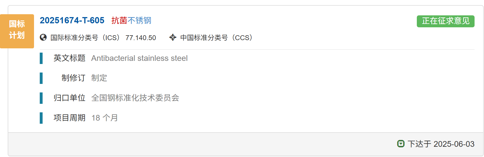 國家標(biāo)準(zhǔn)《抗菌不銹鋼》正在征求意見中,歡迎報名成為參編單位并提出修改意見和建議。01 國家標(biāo)準(zhǔn)計(jì)劃《抗菌不銹鋼》已下達(dá)國家標(biāo)準(zhǔn)計(jì)劃《